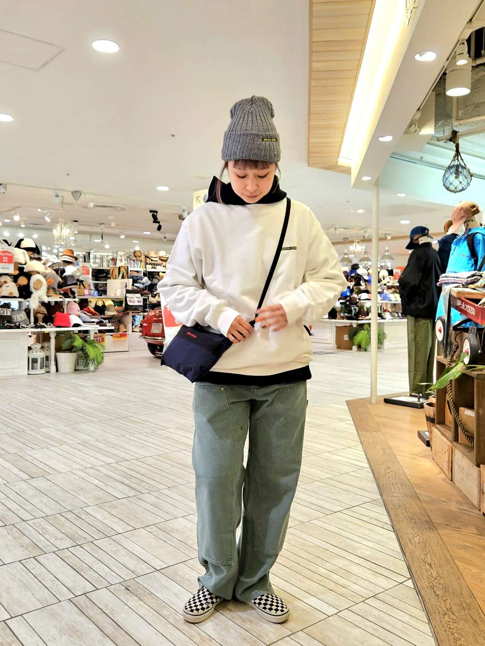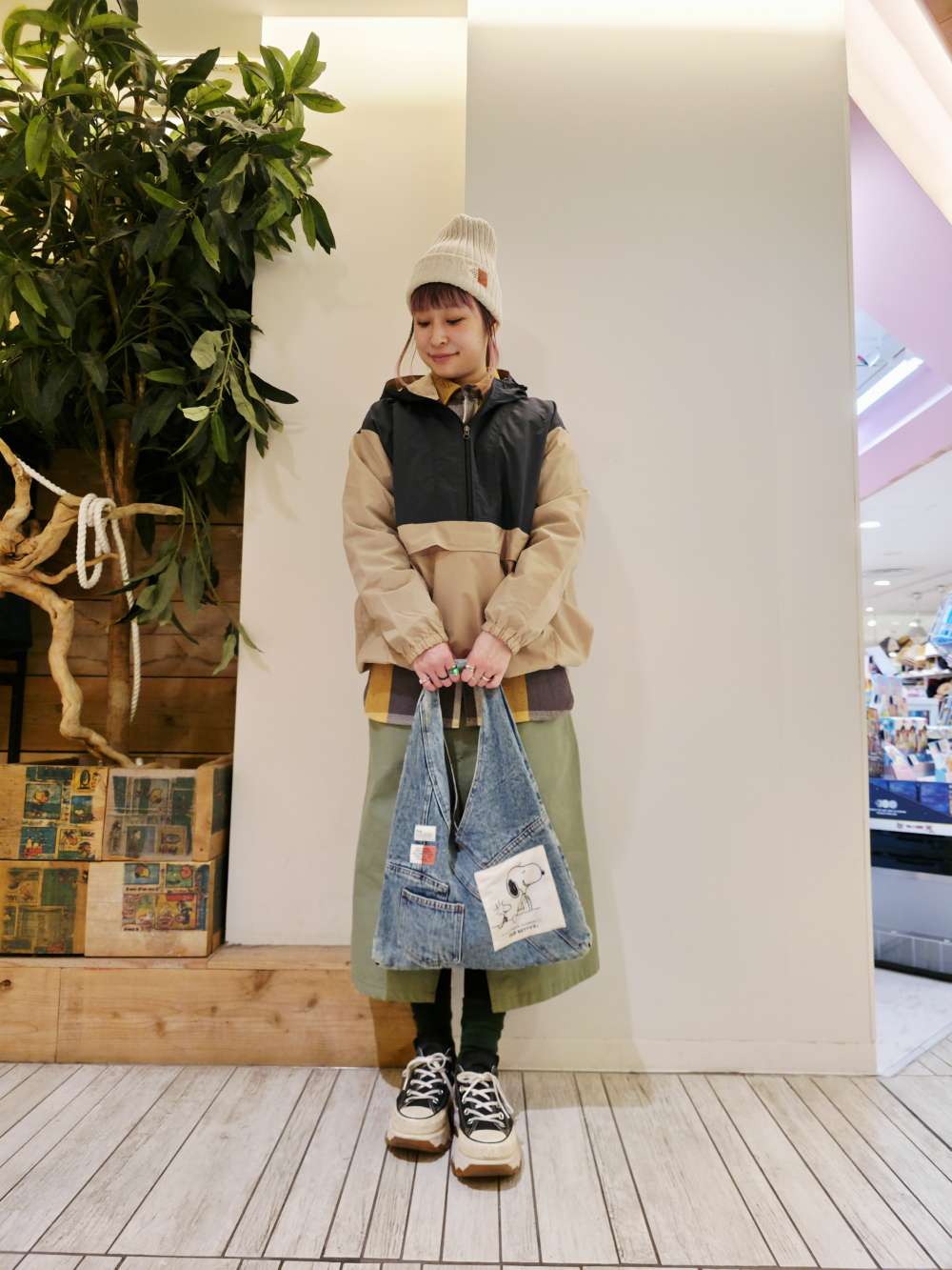 ベージュのナイロンプルパーカーに厚手生地のチェックシャツ。 ボトムスもグリーンカラーで合わせ落ち着いた組み合わせに。 ポイントにスヌーピーデニムバッグ...