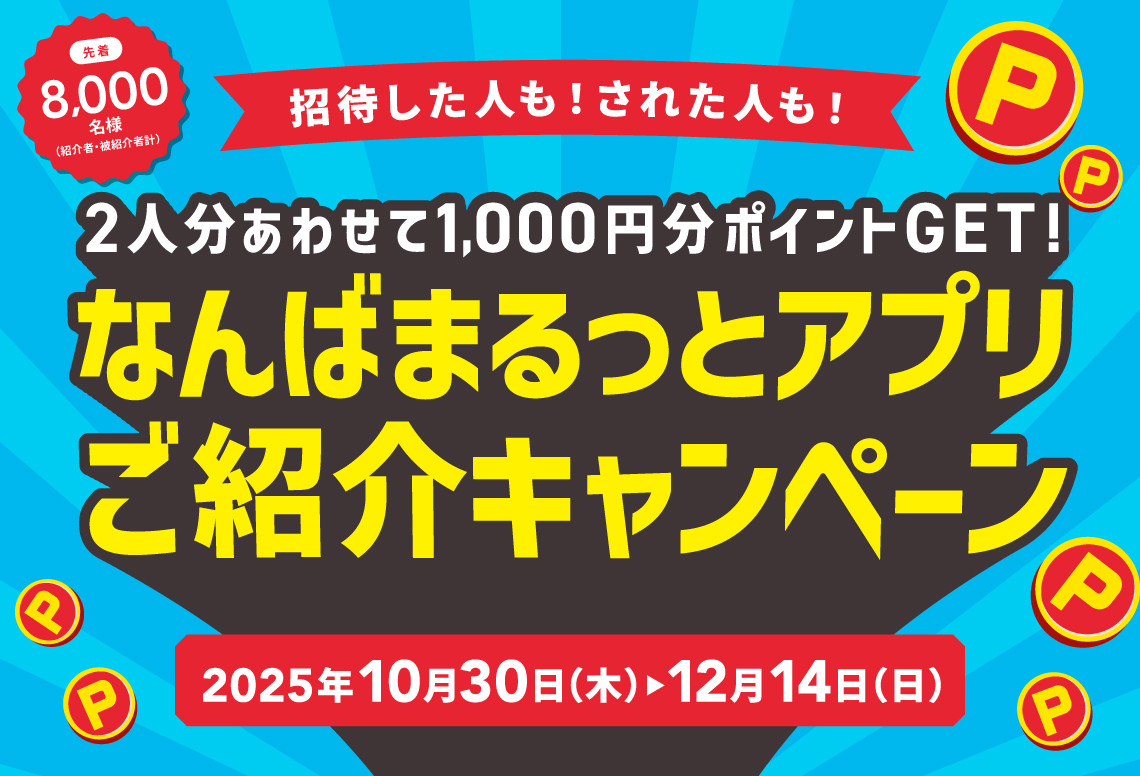 期間中、なんばまるっとアプリ新規ダウンロードの方をぜひご招待ください!