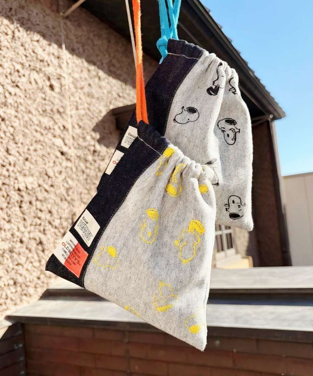 オリジナルSNOOPYプリントを施した巾着ポーチ★ 縦:20/ 横:19の使いやすいサイズで作っております! 切替のデニムもアクセントになって可愛いで...