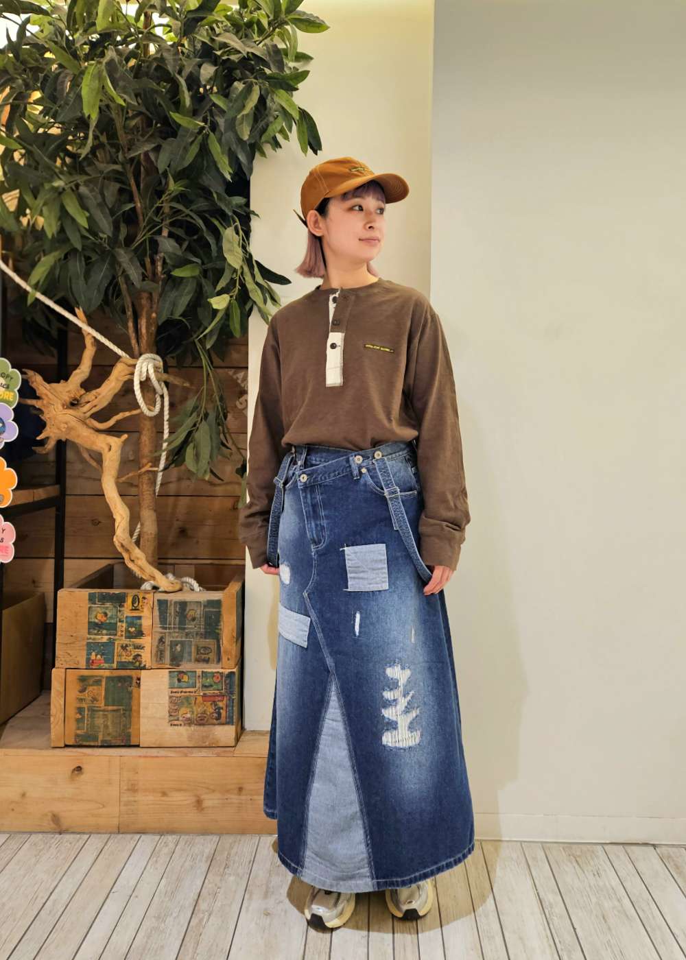 120z ムラインディゴデニムを使用したサスペンダースカート。 特殊な洗い加工やダメージ加工、パッチワークを施す事で、リアルなヴィンテージ風の外観に仕...