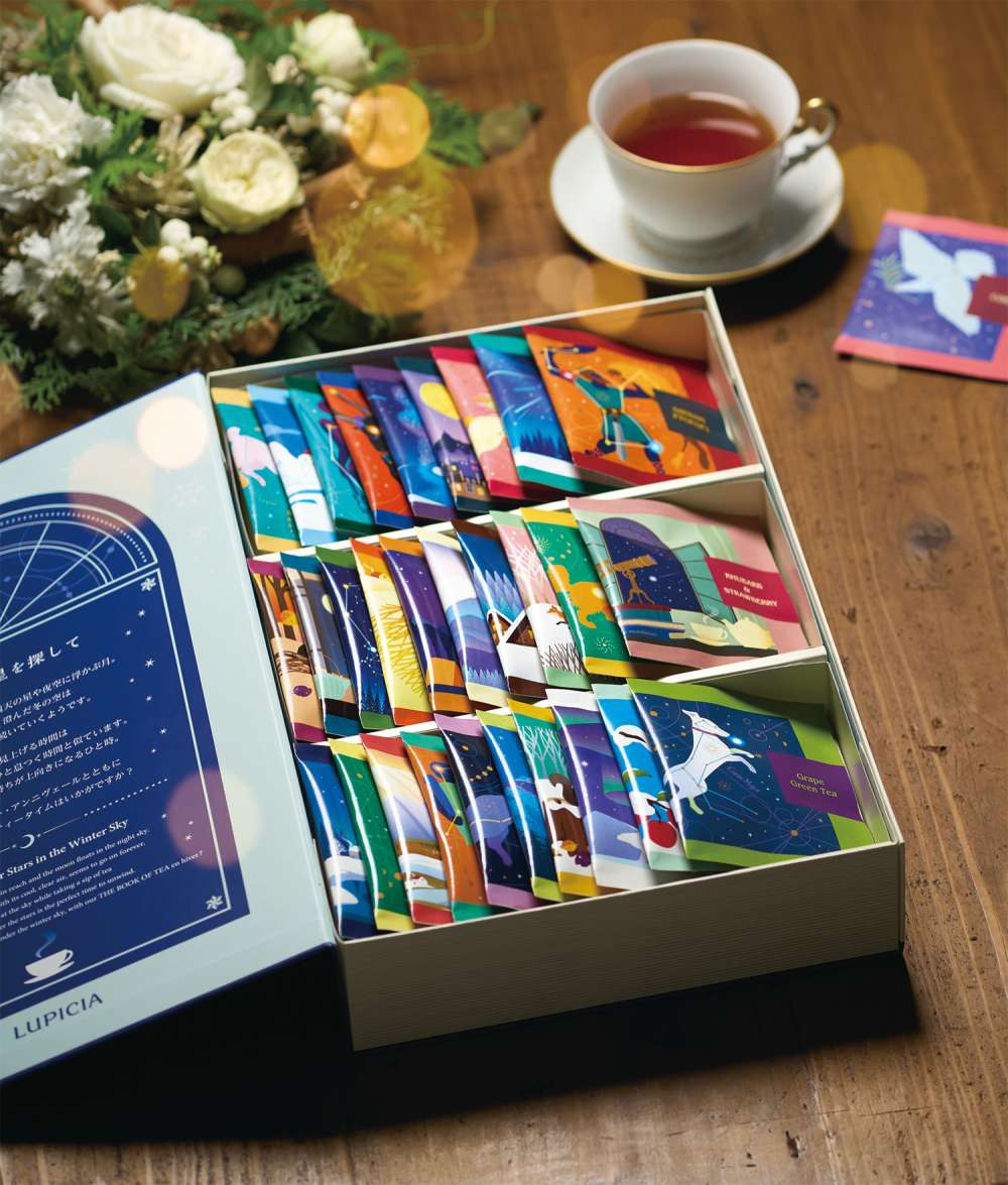 ティーバッグひとつひとつには、冬の星座や天体、雪や風といった自然の情景をモチーフに、空を見上げるひとときをイメージした多彩なデザインを施しています。
