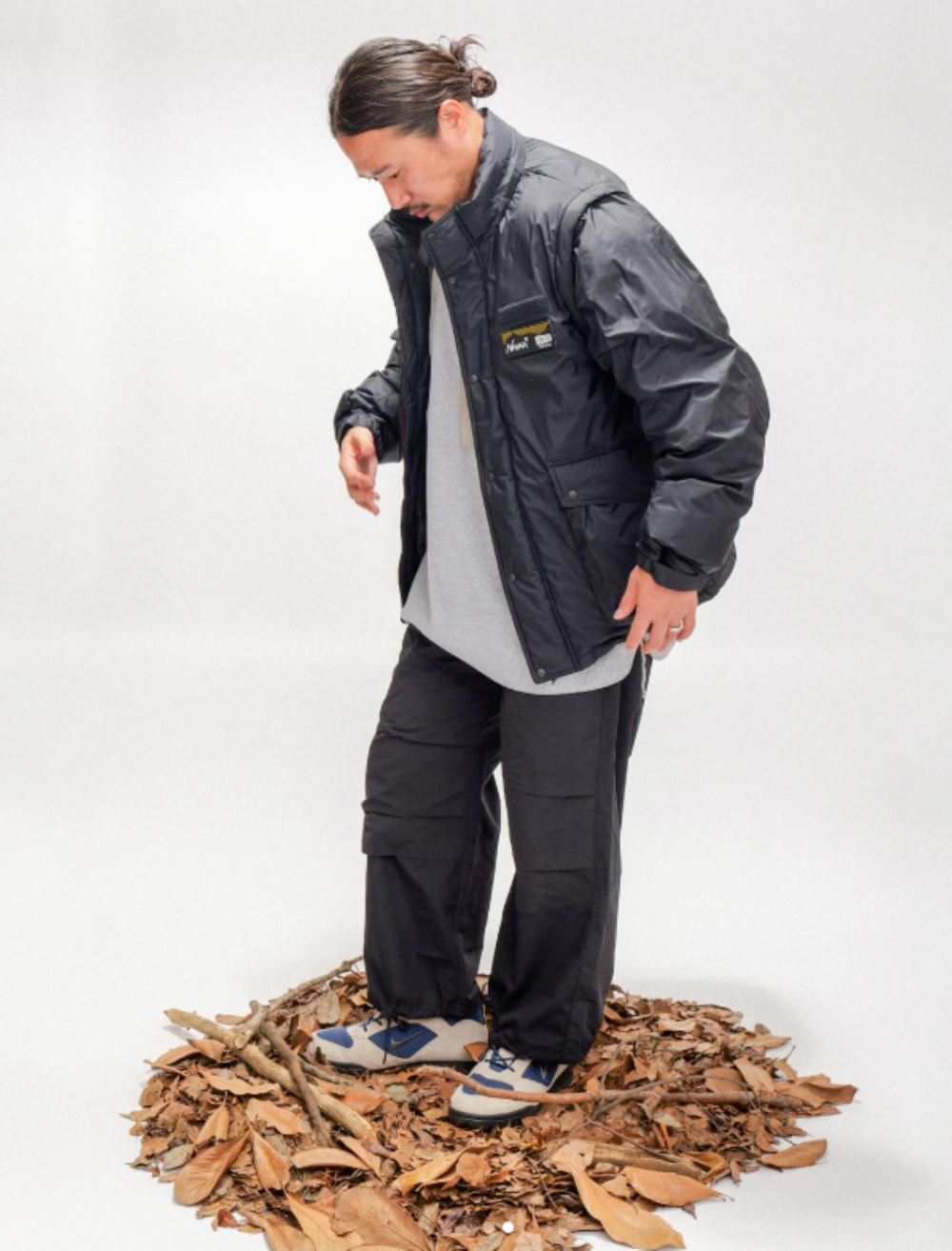 今年はNANGAのHINOC(難燃シリーズ)のダウンベストをベースにサイズ感を見直し、インラインにはないフード/袖つけ外し可能でダウンベストとしても使えるダウンジャケットを作りました。