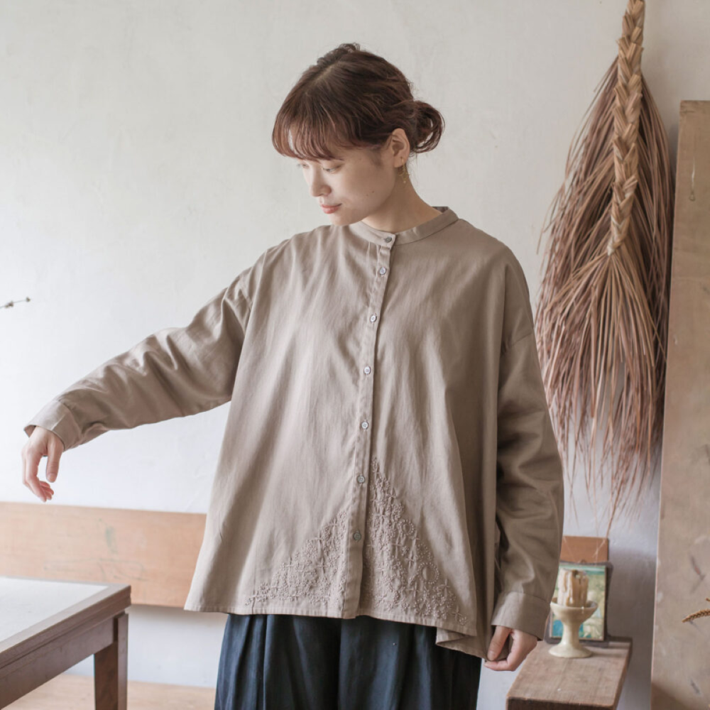ジャケットの裾からのシャツの手刺繍がちらりとのぞきます。