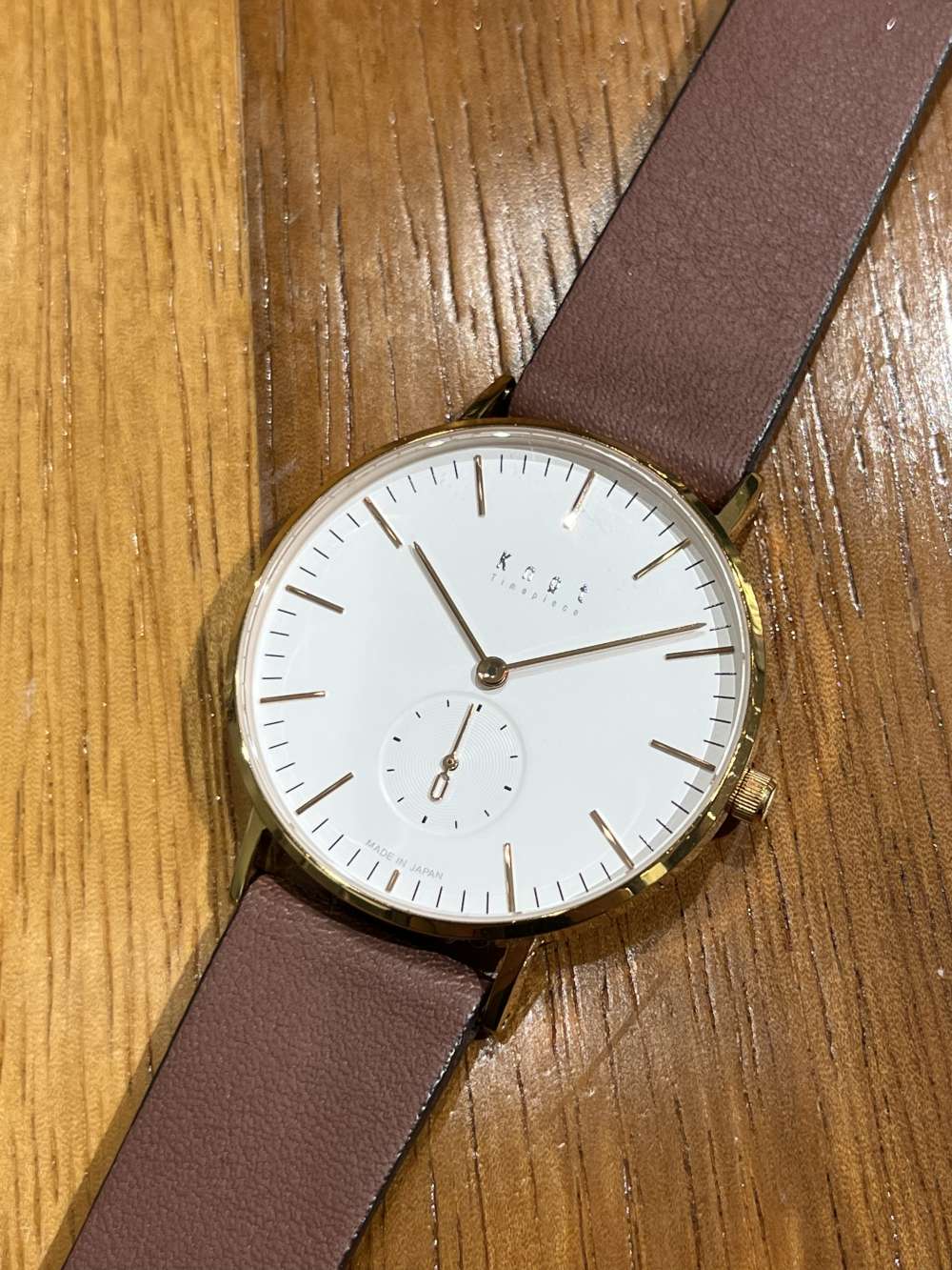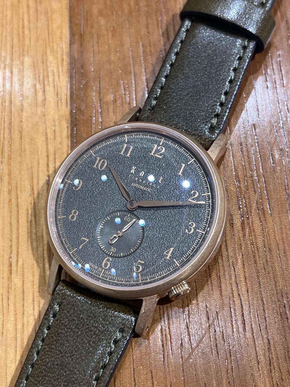 アンティーク調の機械式モデルにオリーブ色のレザーストラップを合わせました。