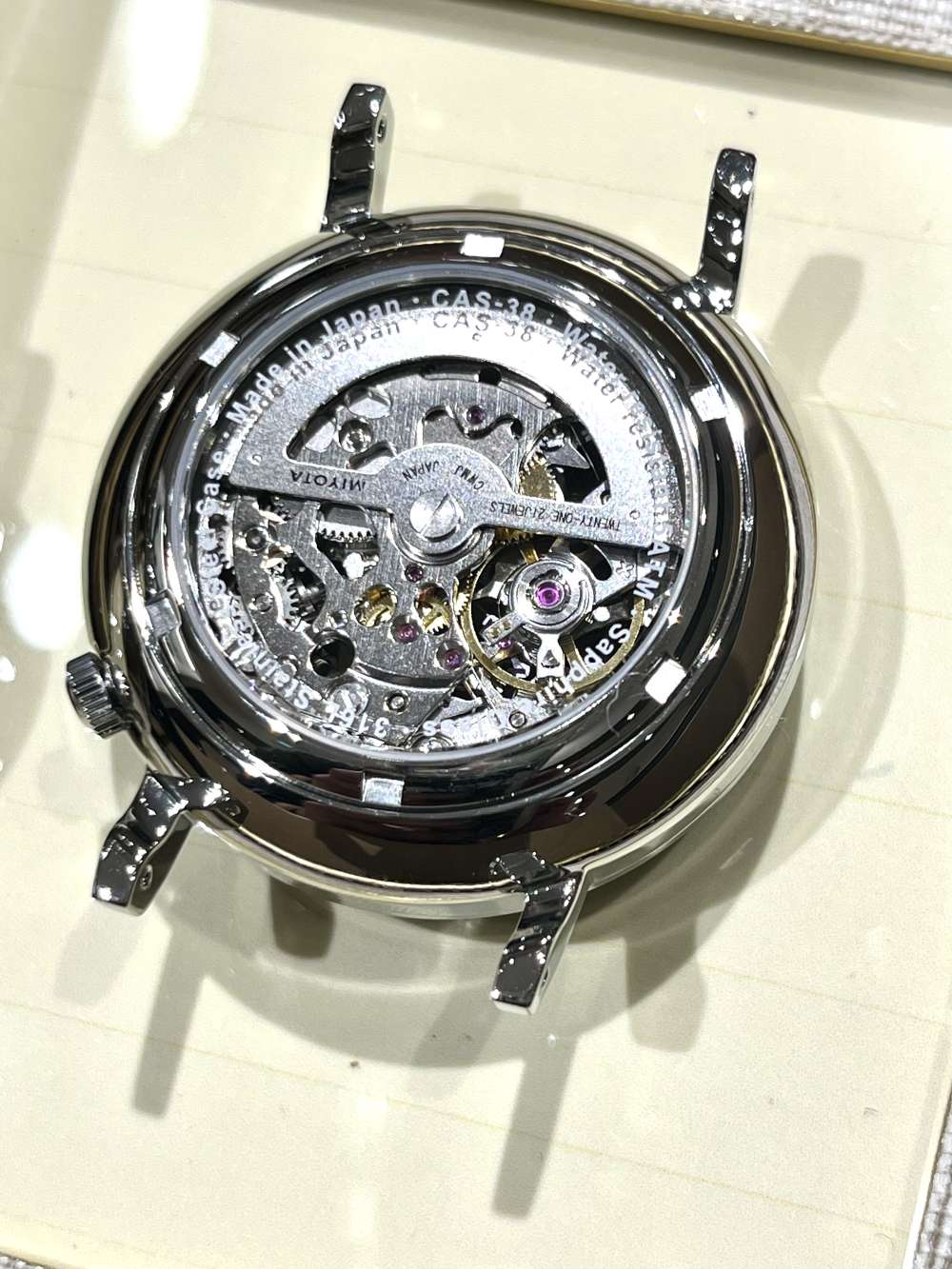まさに「見せる」ためのシースルーバック。小さな歯車やパーツが絡み合い、精密な動きを間近で見ることができるのは機械式時計好きにはたまらない仕様。
