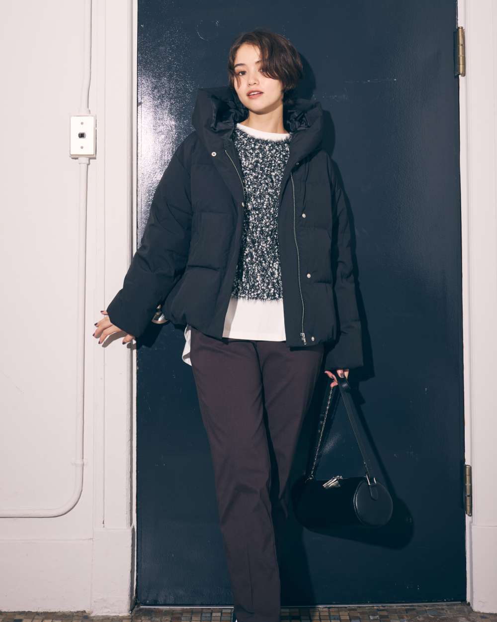 ボリュームのあるフードデザインのショートダウン。