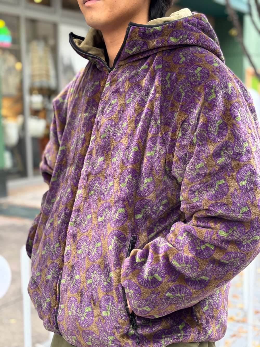 オウムガイの模様がデザインされたリバーシブルボアジャケット。
