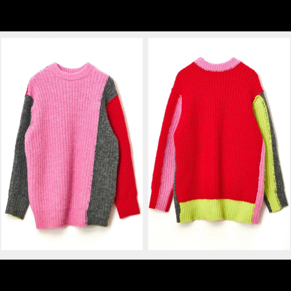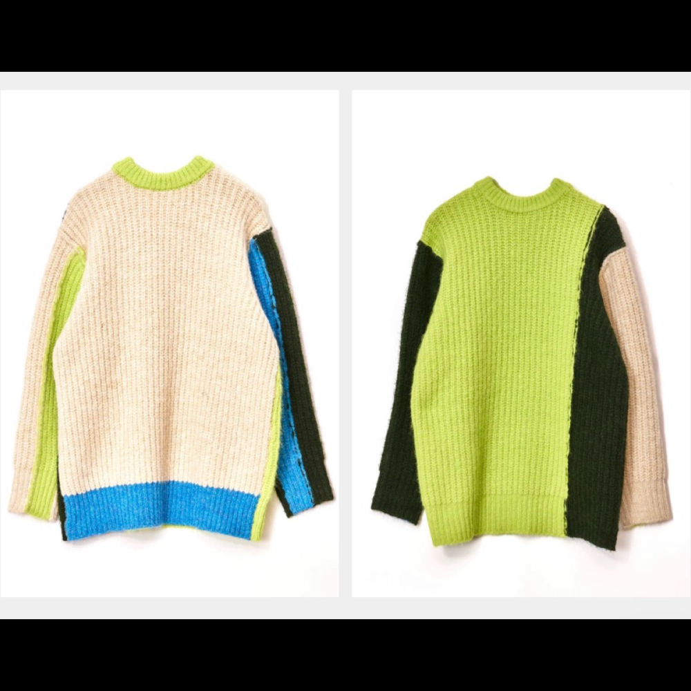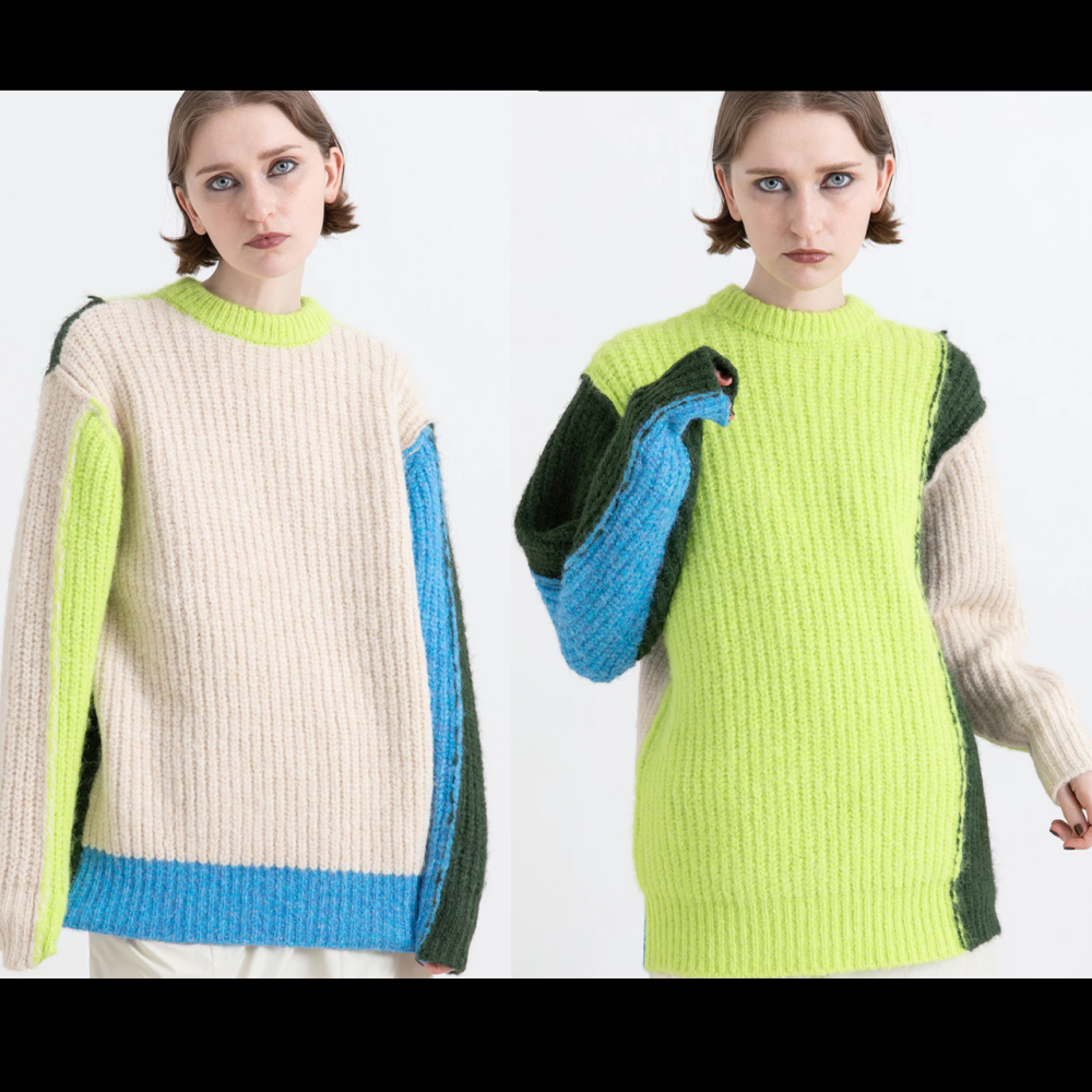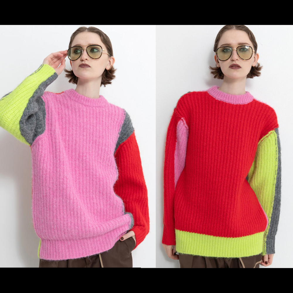 回収されたペットボトルから作られたリサイクルポリエステル糸が混紡されたモヘアタッチのカラーニット。