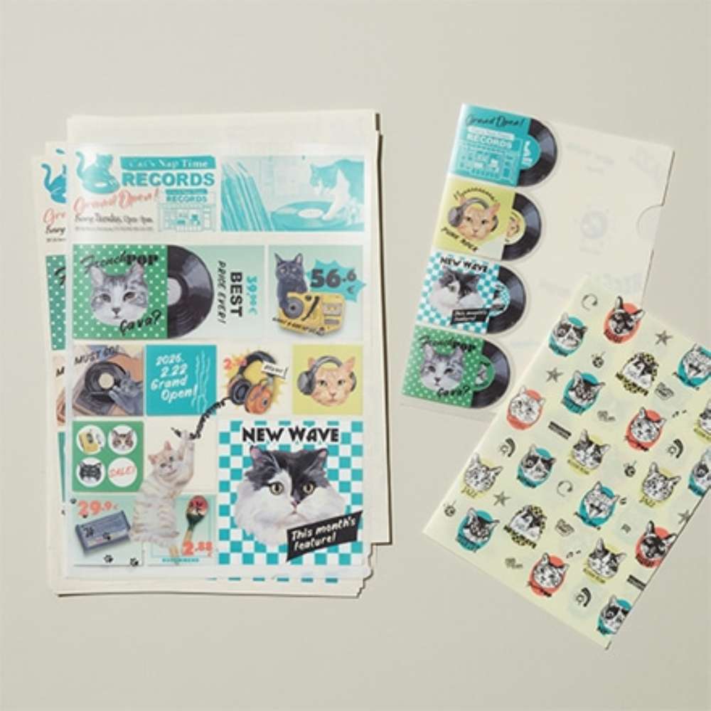 ヘッドフォン姿やレコードにいたずらしている姿など思い思いに音楽を楽しむネコたちのアイテムが勢ぞろい!