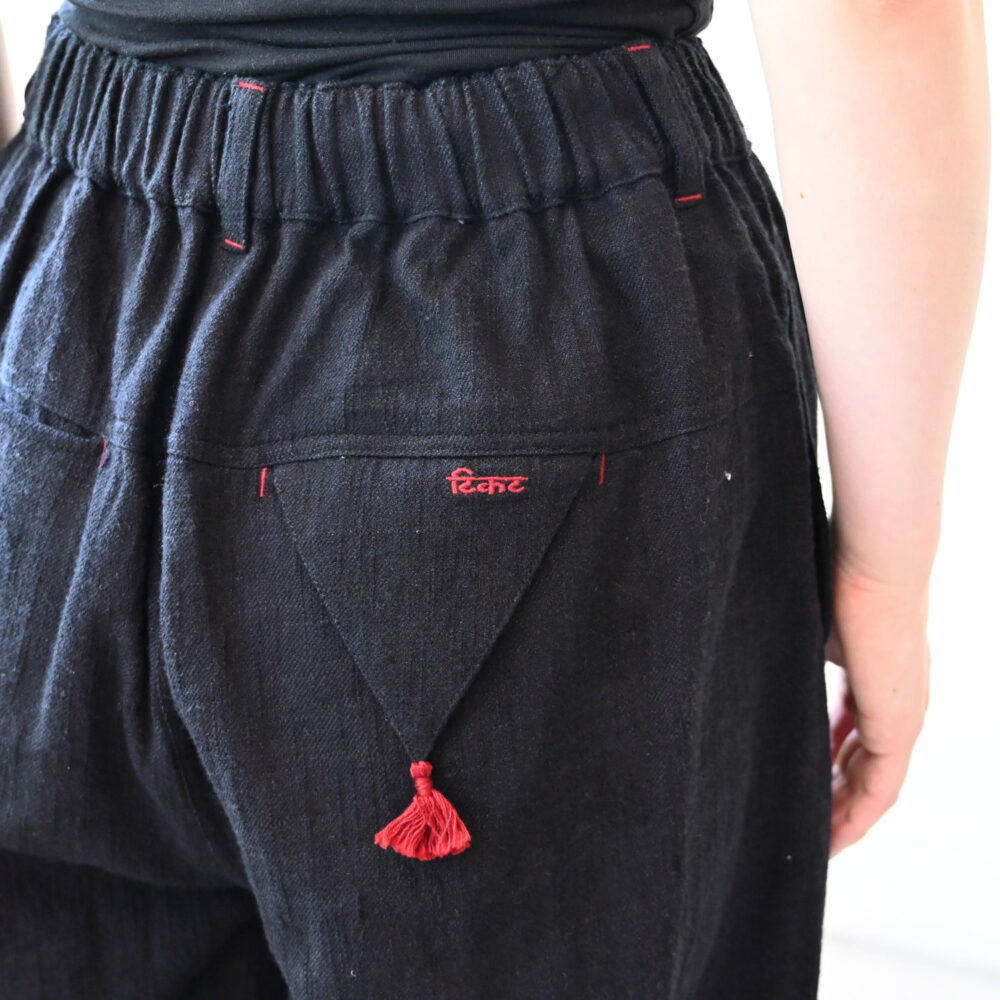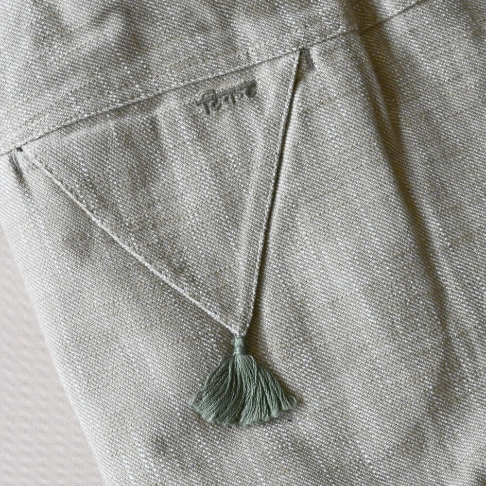 このパンツの最大の特徴、それは…一目でわかる、可愛いタッセル付きのポケットフラップ!