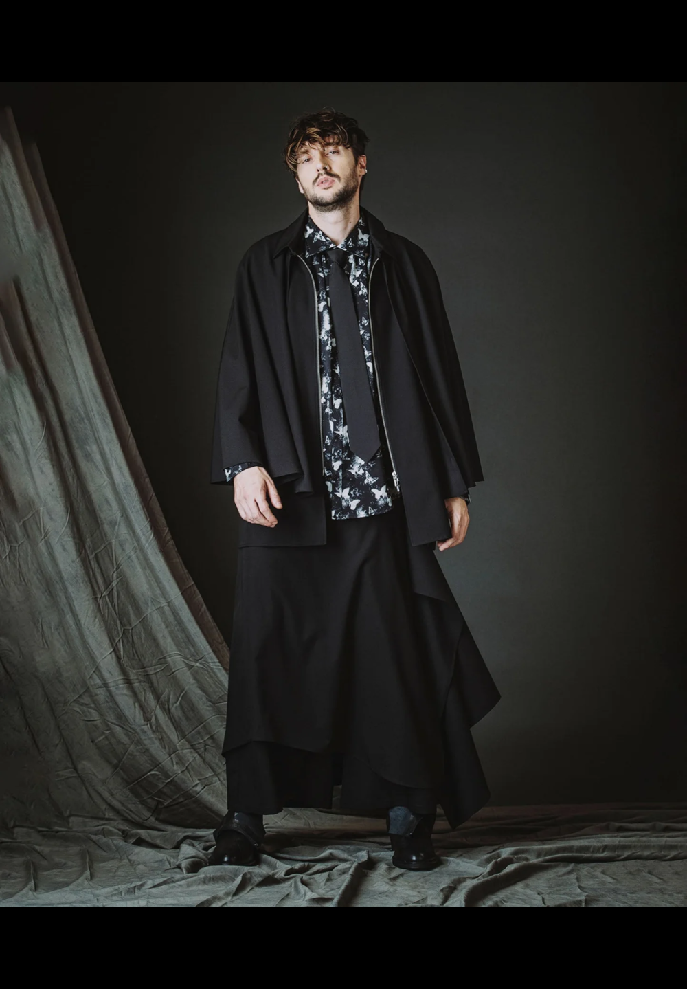 シャツの上からケープを羽織った様に見える躍動感あふれるZIPシャツ。ケープ部分は取り外し可能でノースリーブシャツとしても着用可能なフレキシブルデザインとなっている。