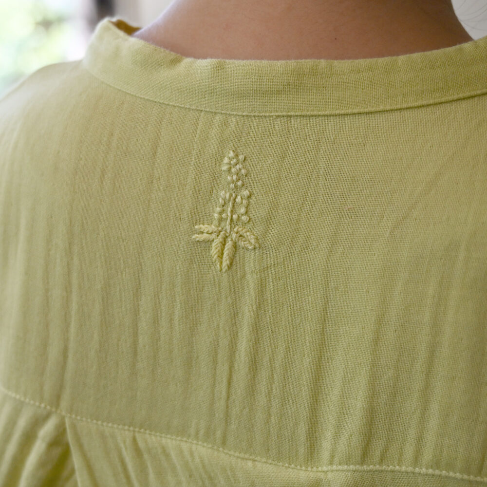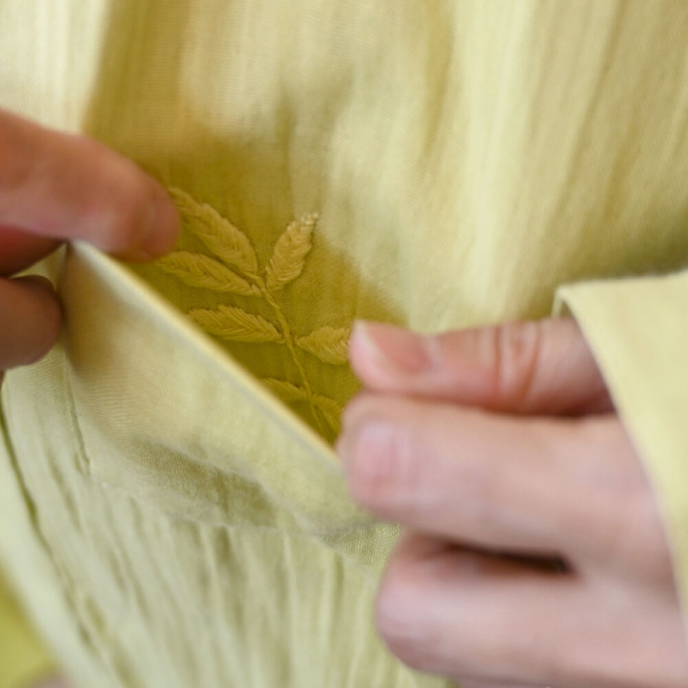 そんな言い伝えから、右胸のポケットの中にニームの葉をこっそりと手刺繍でしのばせませています。