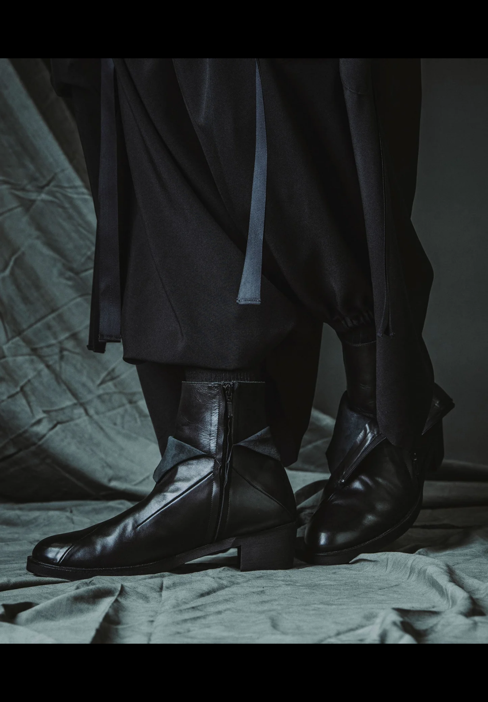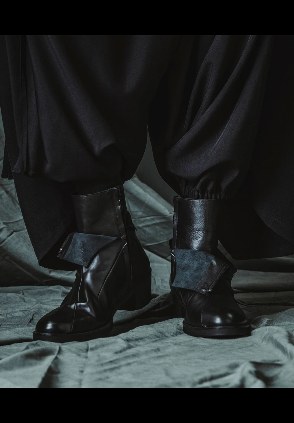 NO ID.のコーディネートには必須のドレープヒールブーツと同じ木型を使用した本作は1.2mm厚のカウレザーを贅沢に2枚使いによりレイヤードを表現。