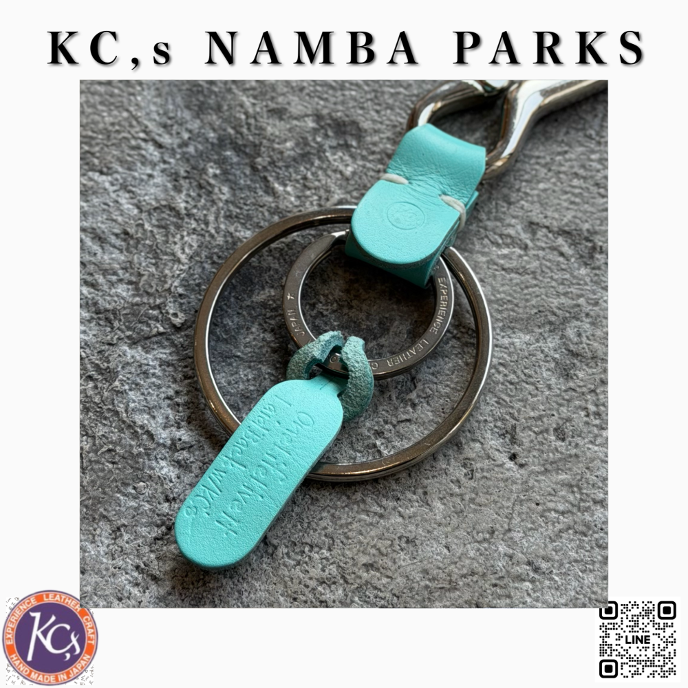 発色の良いターコイズブルーのレザーを使用したキーリング。
