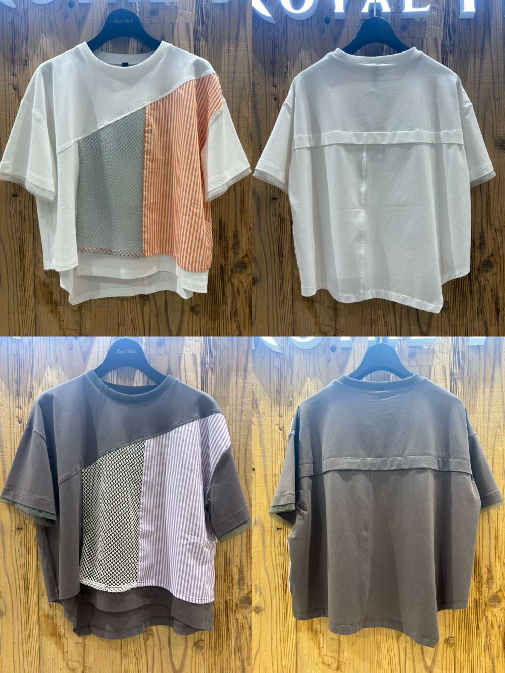 フロントに重ねた大メッシュとストライプシャツTシャツの配色が目を引くTシャツ。