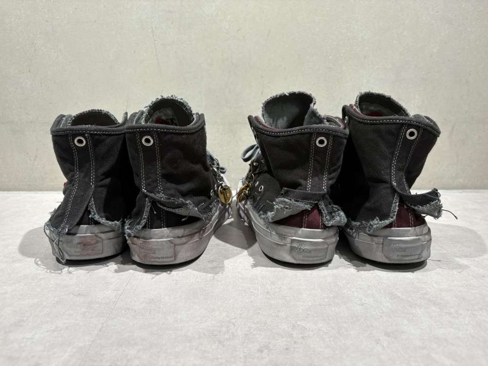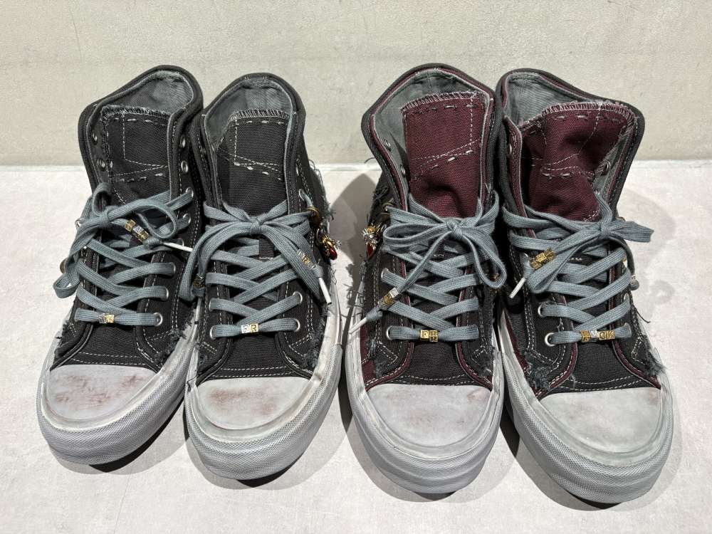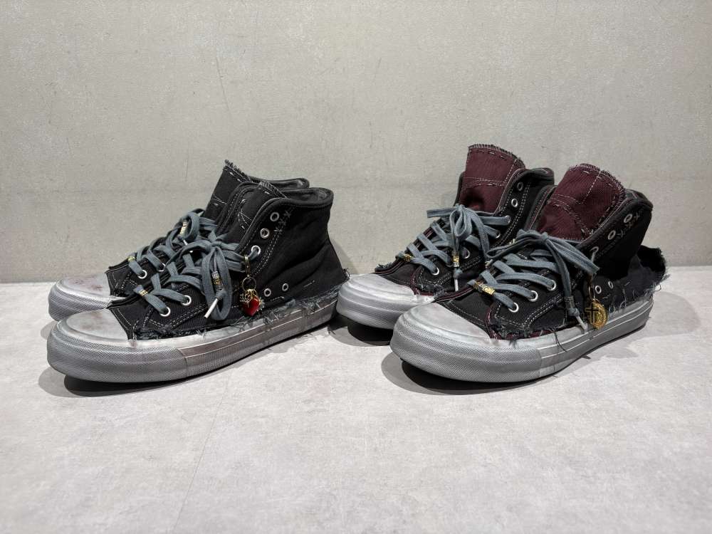 アッパーにはコットン100%素材を使用し、履き込んだような風合いを演出する汚し加工とダメージ加工を施すことで、ヴィンテージライクな表情に仕上げています。
