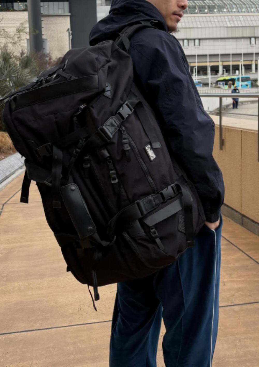 バッグの底面に収納されているショルダーハーネスを取り出すことで、バックパックとしても使用ができるので、長時間の移動や防犯面での対策にも🙆