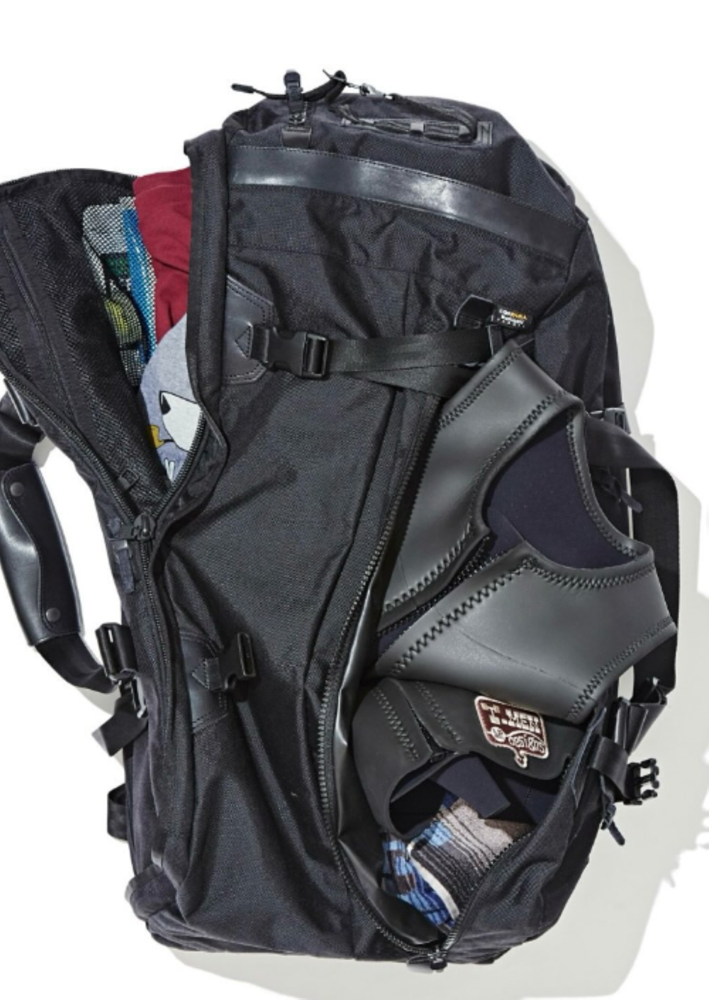 メイン収納は一般的なライニングの収納とPUコーティングが施された収納の2つに分かれており、濡れた荷物やスニーカーなどの汚れているものと、そのほかの水気や汚れを移したくない荷物を分けて収納することができます👌