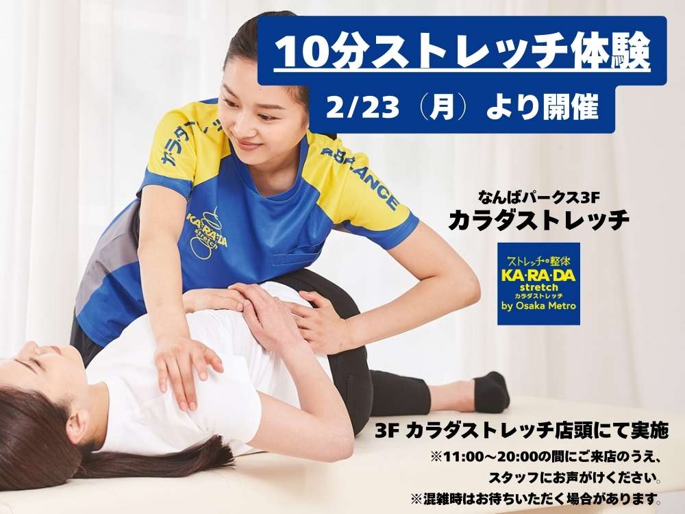 カラダストレッチ なんばパークス店で、 2月23日(月)より、店頭にて「10分ストレッチ体験」を実施いたします! 肩や腰まわりを中心に、短時間で身体...