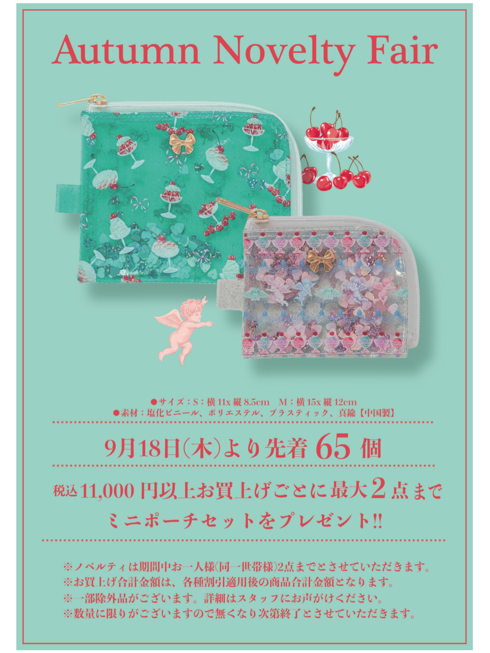 🍨🍒ノベルティフェアのお知らせ🍒🍨 9/18(金)START🌟 税込11,000円ご購入毎にポーチのセットをプレゼント👼🏻🍨🍒 ※期間中、同一世...