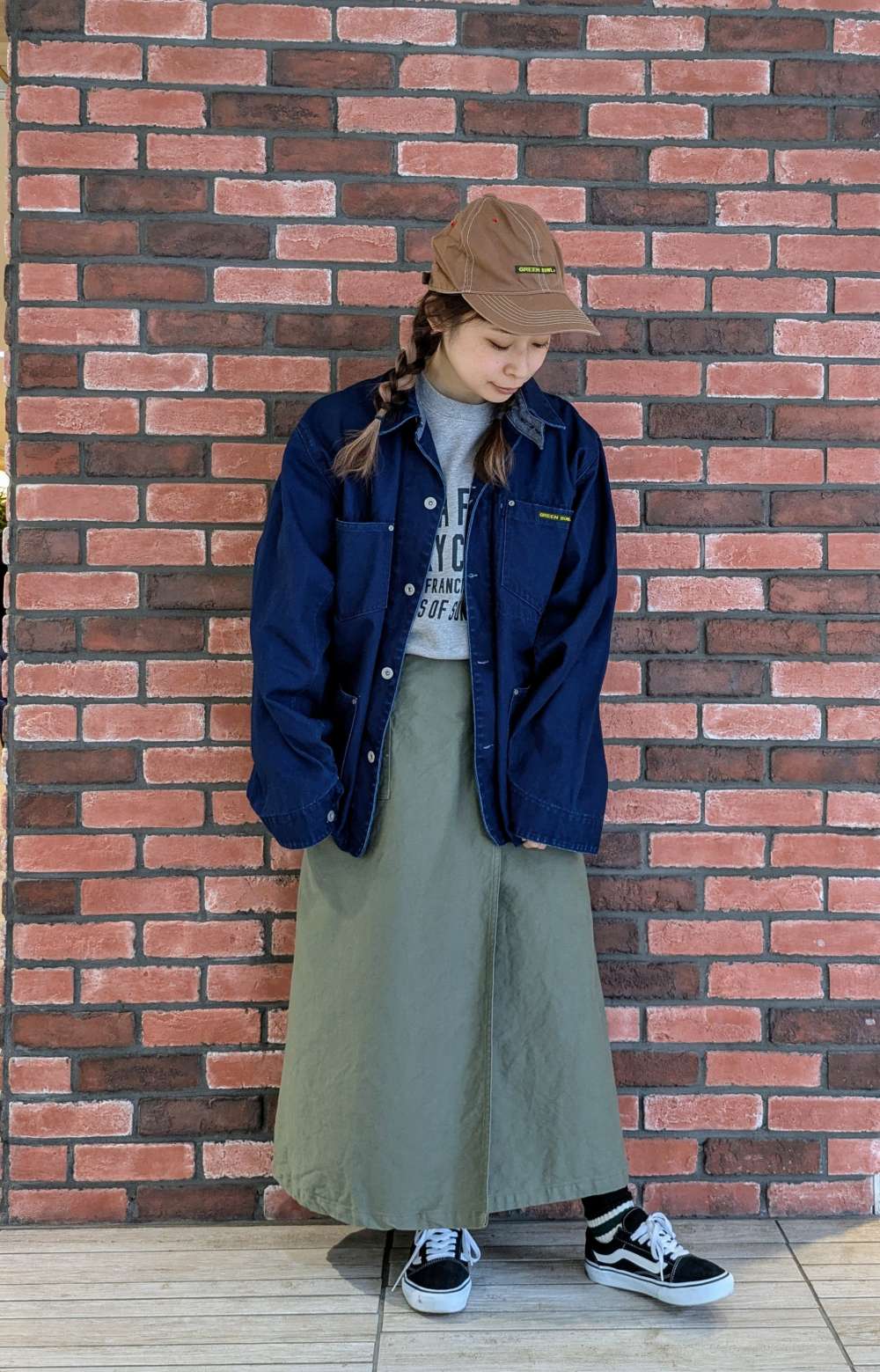カーキのラップスカートでコーディネート。 台形シルエットなのでラインがキレイです。トップスのトレーナーを少しウエストでINすると、バランスがとり易く縦...